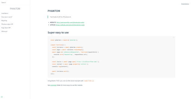 Phantom is a module for integrating PhantomJs with Node. This project is no longer maintained because PhantomJs has been deprecated.